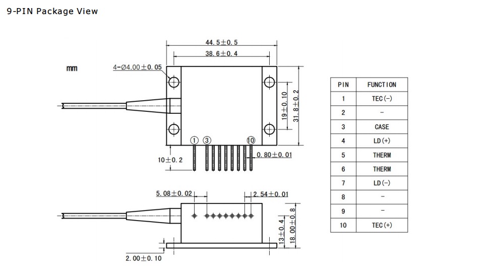 Produktzeichnung eines 375 nm, 100 mW Hochleistungs-9-Pin-105-µm-Faser-Pigtail-Diodenlasermoduls