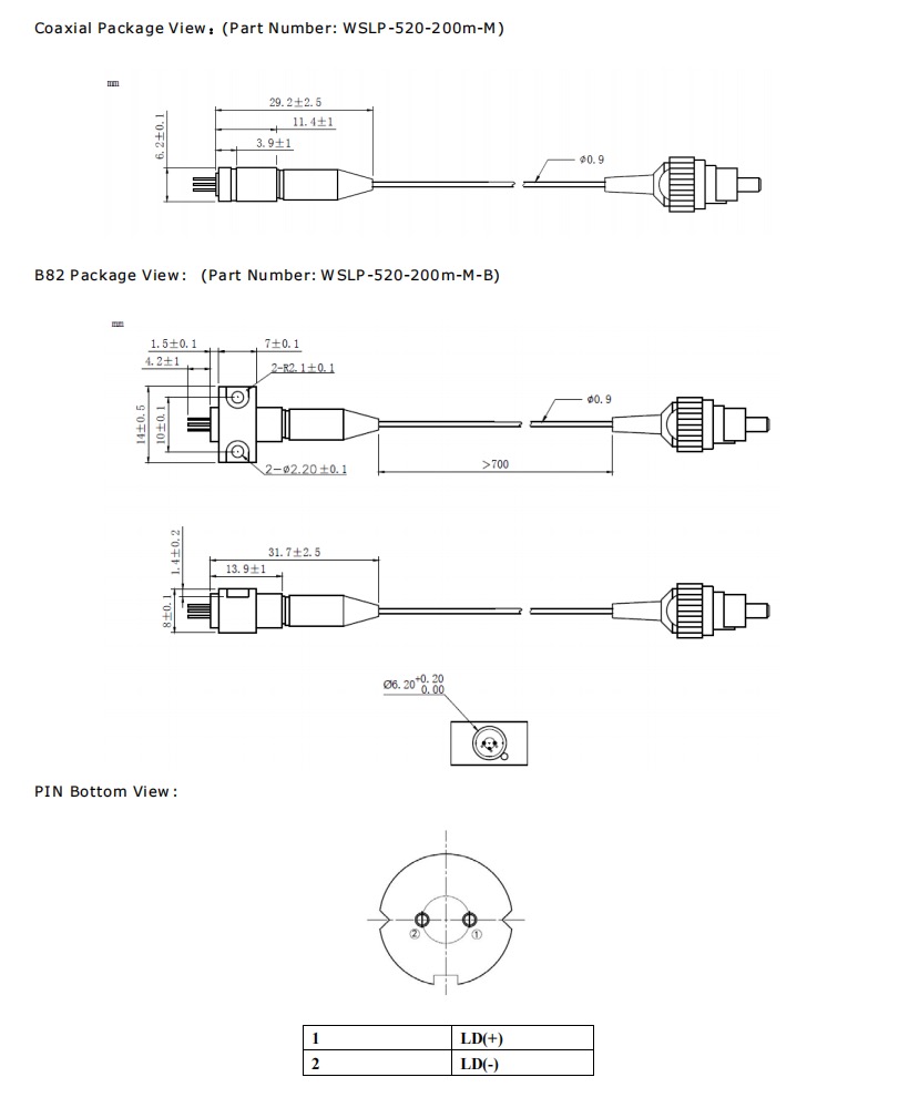 Produktzeichnung des 520 nm 200 mW 105 µm Multimode-Glasfaser-gekoppelten LD-Moduls