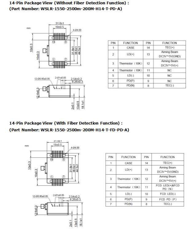 Product Drawing of 1550nm 2.5W 14-Pin Fiber Detachable Diode Laser Module
