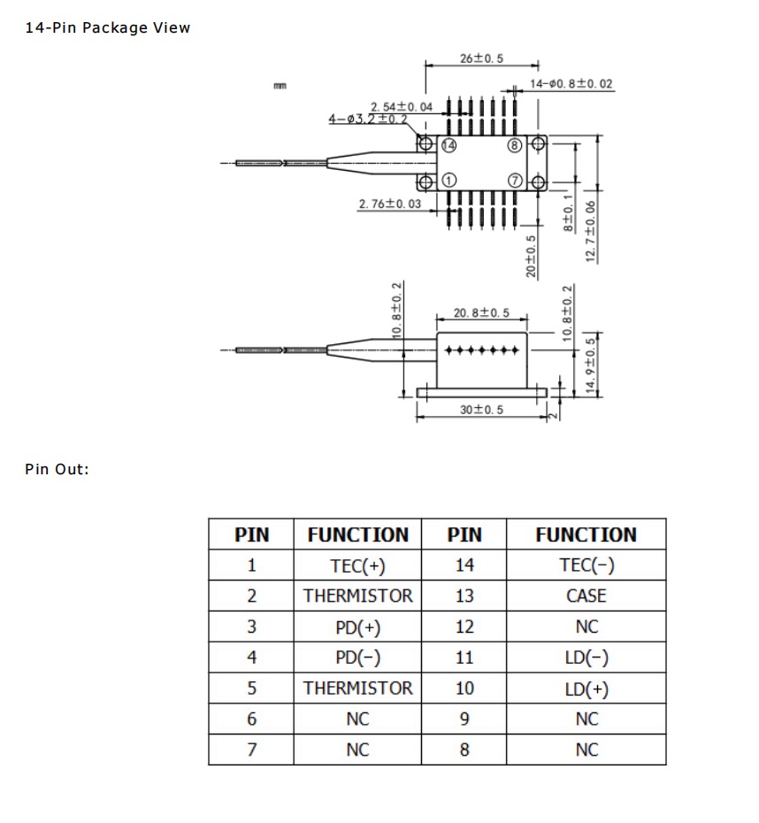 Product Drawing of 405nm 400mW with TEC 14-Pin Butterfly Fiber Coupled Laser Diode Module