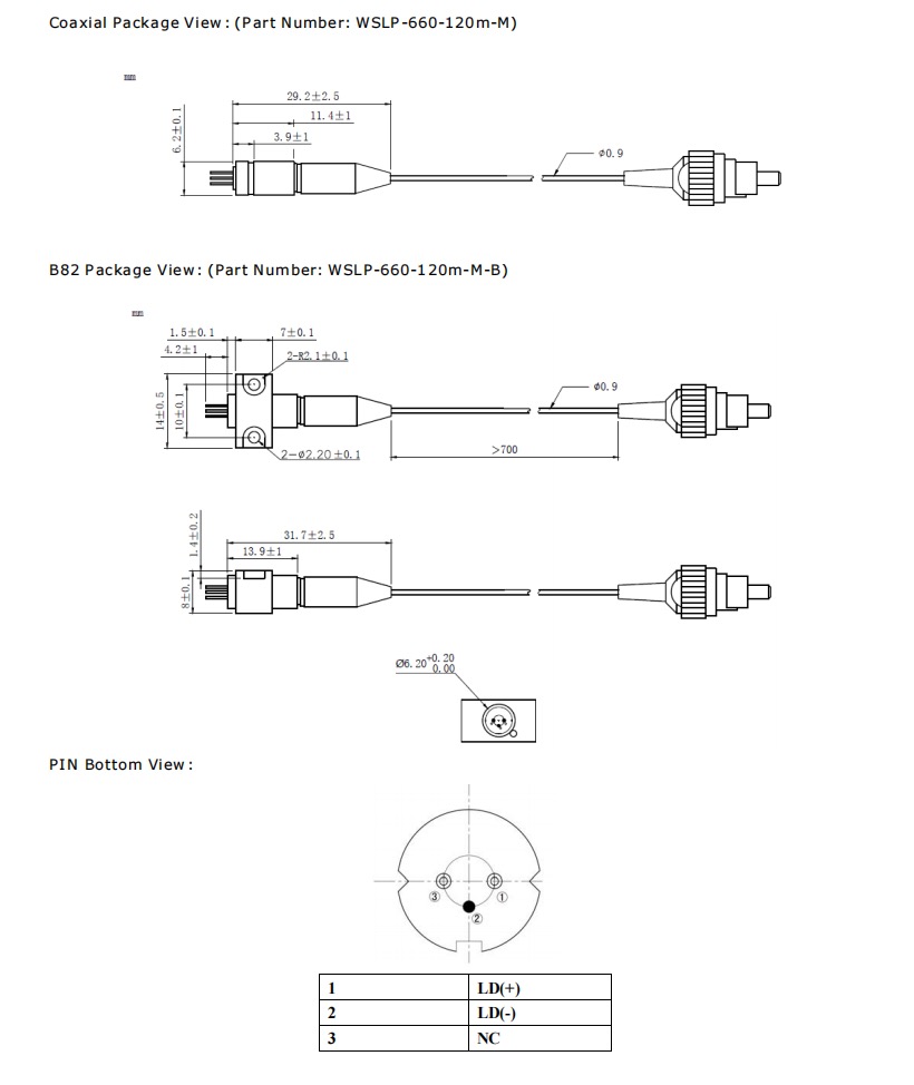 Dibujo del producto del módulo de diodo láser acoplado a fibra de 660 nm, 120 mW y 105 um.