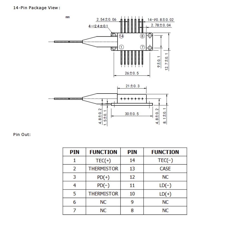 Product Drawing of 660nm 1W 14-Pin butterfly 50um fiber pigtailed diode laser module