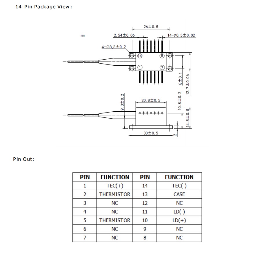 Dessin technique du module laser à diode à fibre optique pigtailée de 495 nm, 80 mW, 14 broches, 105 µm