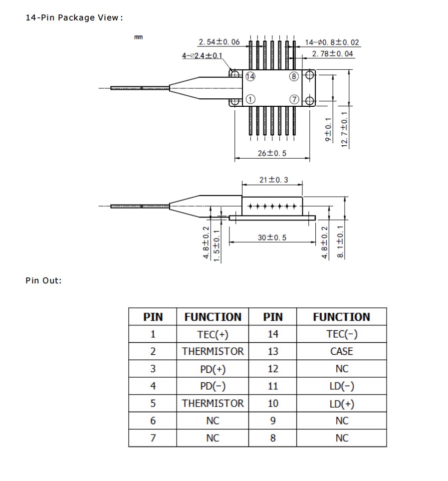 Schéma technique du module laser à diode couplé à fibre papillon TEC 14 broches 660 nm 1 W