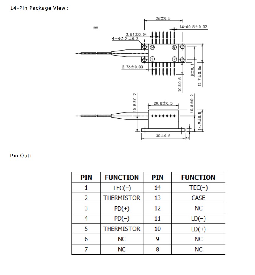 Caratteristiche del prodotto 410 nm 300 mW con modulo diodo laser accoppiato a fibra a farfalla TEC a 14 pin