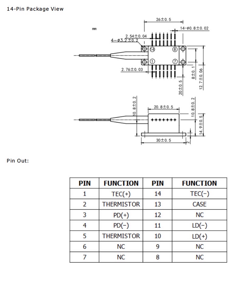 405nm 600mW 14ピン バタフライ 105μm ファイバーピグテイル付きダイオードレーザーモジュールの製品図面