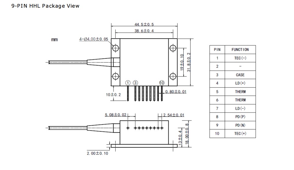 455nm 4W高出力 9ピン 200μmファイバーピグテール付きダイオードレーザーモジュールの製品図面