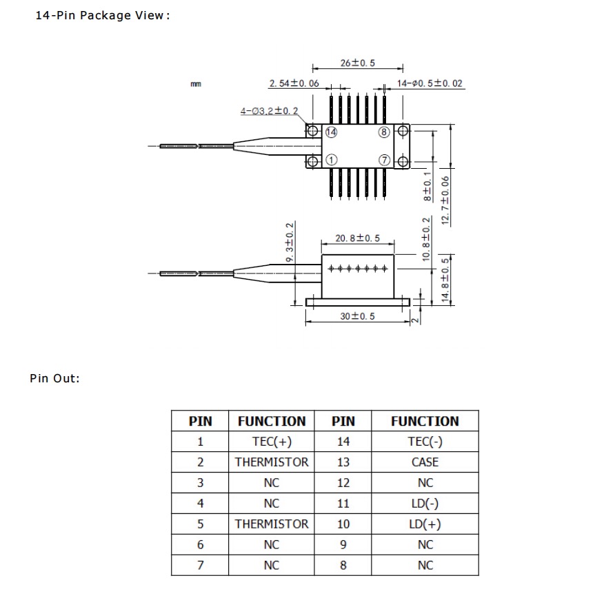 480nm 80mW 14ピン バタフライ 105μm ファイバーピグテイル付きダイオードレーザーモジュールの製品図面