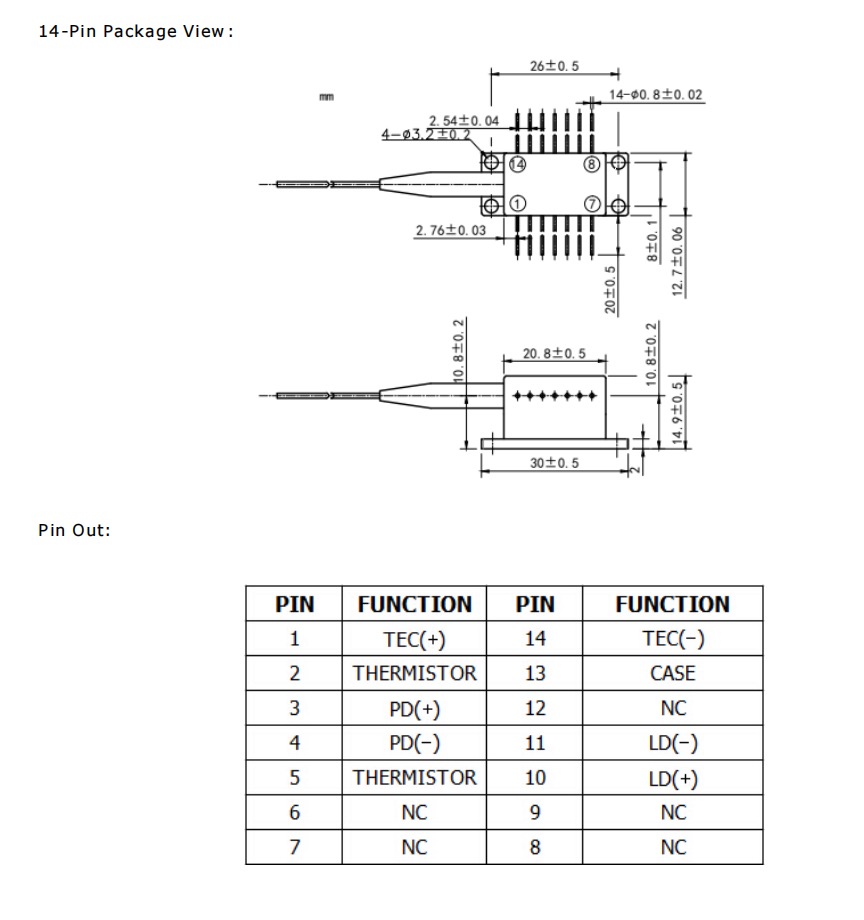 TEC 14핀 버터플라이 파이버 커플링 레이저 다이오드 모듈이 장착된 405nm 300mW 제품 도면