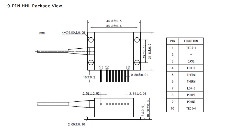 525nm 1.2W 9핀 TEC 광섬유 결합 레이저 다이오드 모듈 제품 도면