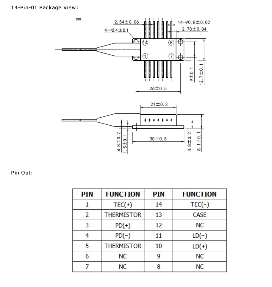 670nm 1W 14핀 나비형 105μm 파이버 피그테일 다이오드 레이저 모듈 제품 도면