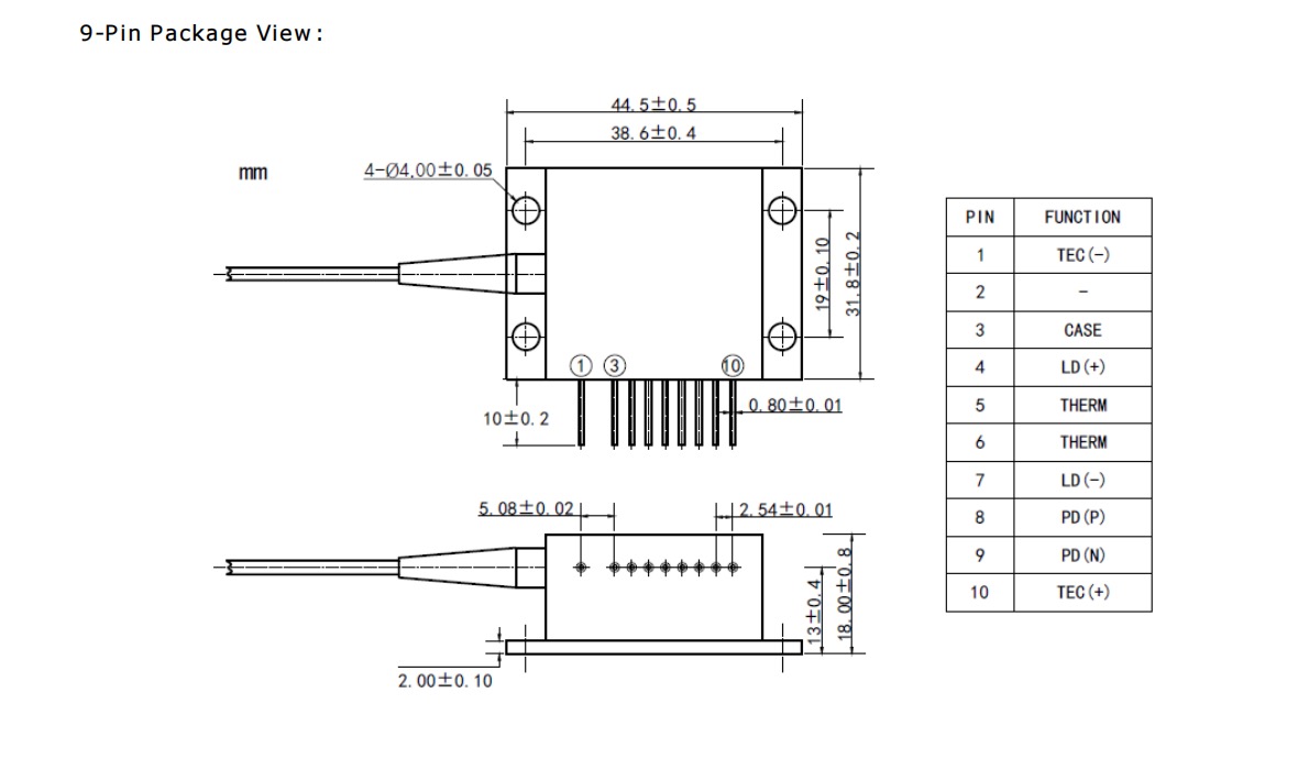 Product Drawing of 1064nm 8W 9-Pin with TEC Fiber Coupled Laser Diode Module
