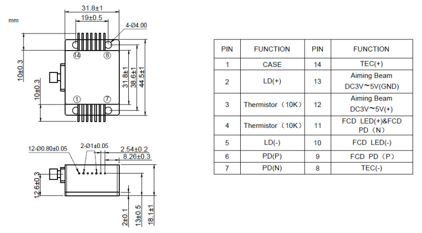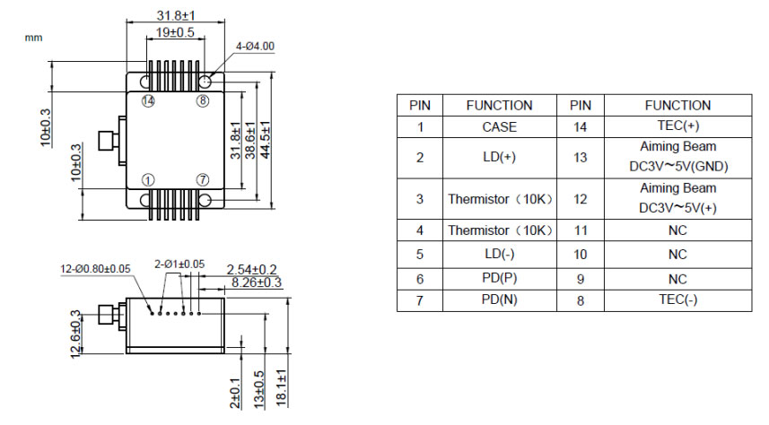 Product Drawing of 1470nm 2.5W 14-Pin Fiber Detachable Diode Laser Module