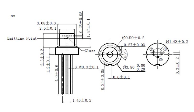 Product Drawing of 405nm 150mW Single Mode Laser Diode with 3.8mm Package