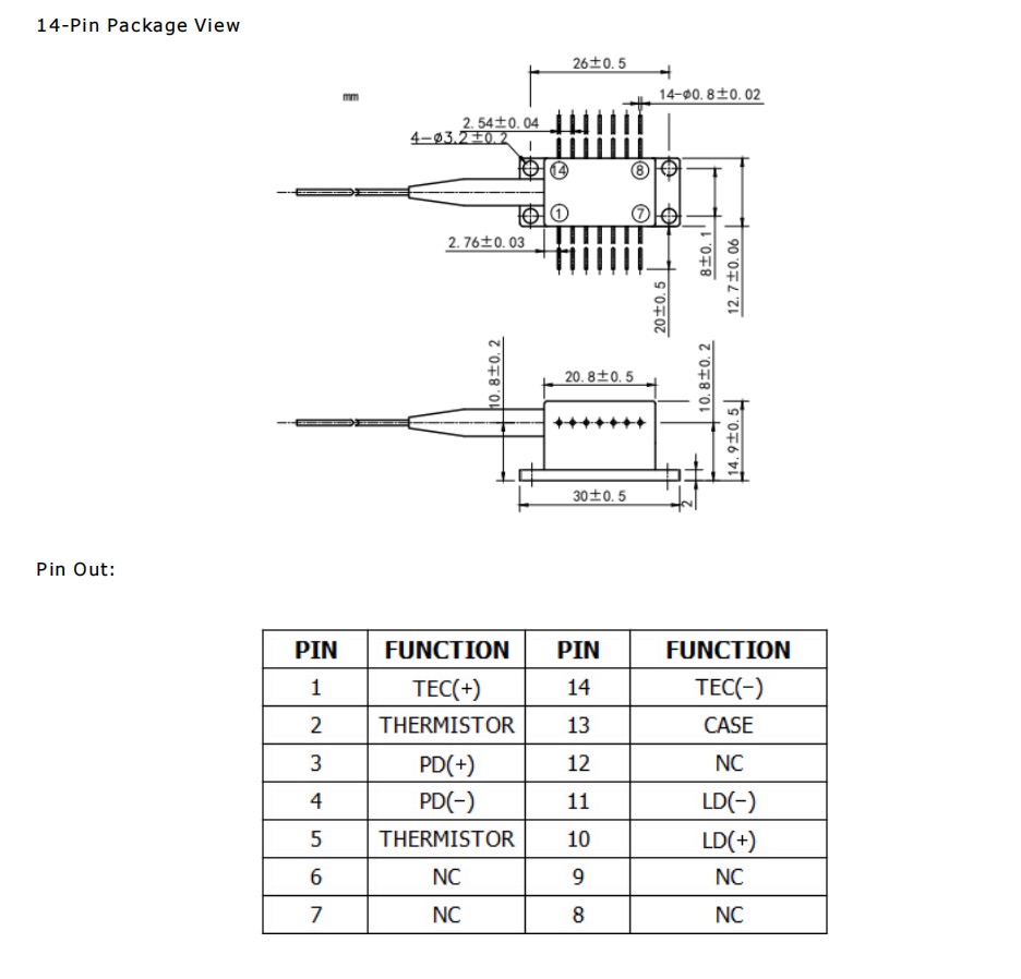Product Drawing of 445nm 1W with TEC 14-Pin Butterfly Fiber Coupled Laser Diode Module