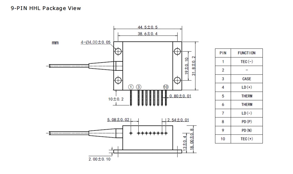 Product Drawing of 630nm 300mW 9-Pin with TEC Fiber Coupled Laser Diode Module