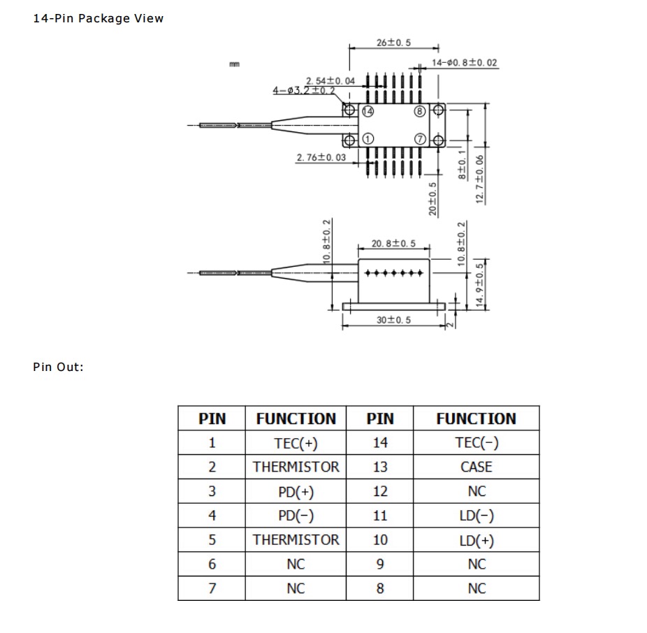 Product Drawing of 635nm 400mW with TEC 14-Pin Butterfly Fiber Coupled Laser Diode Module