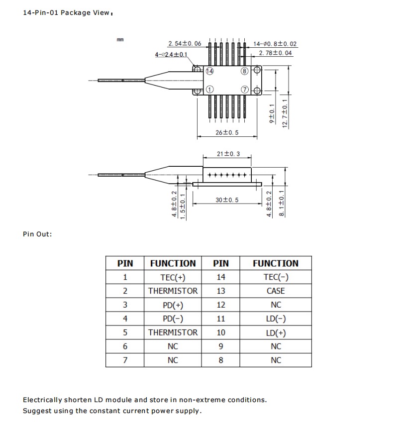 Product Drawing of 980nm 2W 14-Pin butterfly 105um fiber pigtailed diode laser module