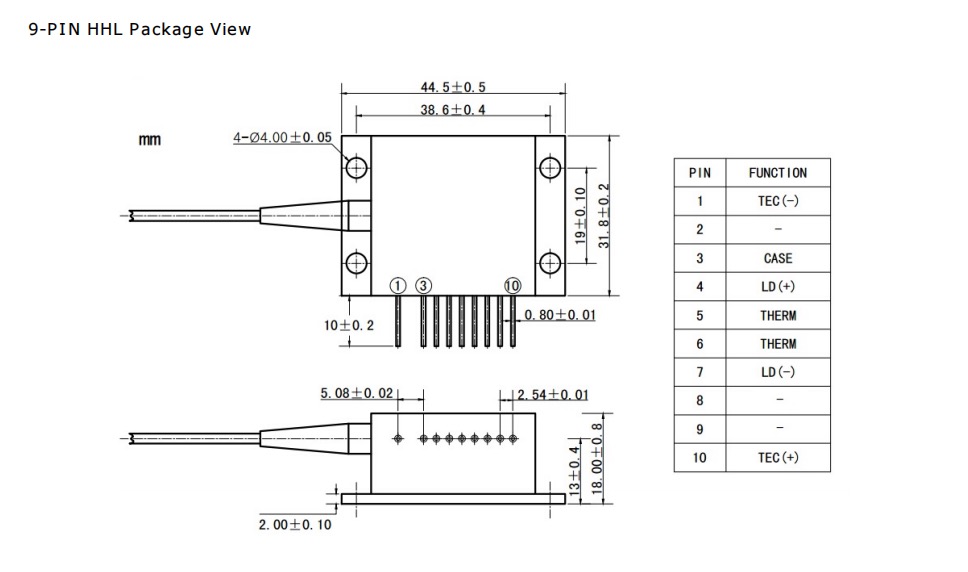 Чертеж продукта 405 нм 1 Вт высокомощного 9-контактного 200 мкм волоконного диодного лазерного модуля с пигтейлом